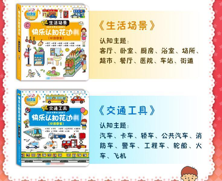 《欢乐认知花边》,这套双语图鉴式的认知读物,正合适您家的小宝贝。这套教材通过小图配单词的形式,介绍了动物,水果,自然,鸟类,昆虫,颜色形状,交通工具,生活场景等启蒙主题,内容超量十足。日式粗线条插图,可爱有趣,能引起小沛有的兴趣;读物装帧精美,圆角设计,不易被撕烂也不伤小手;读物开本小,阅读方便,右页特设花边标签设计,帮助小朋友检索和翻阅。