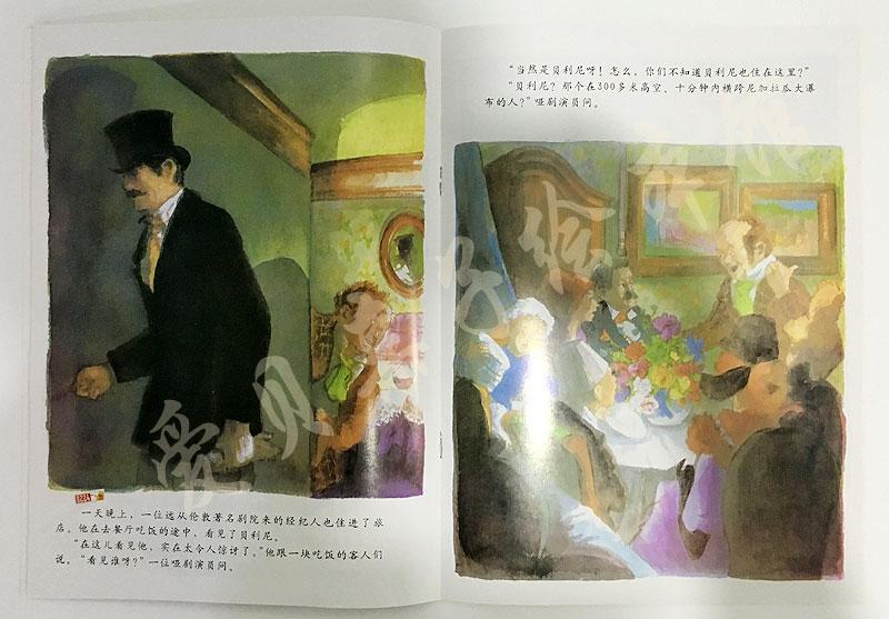 这是凯迪克的获奖绘本。讲述了100多年前一个走钢丝的特技演员贝利尼来到巴黎。当时的巴黎有众多的戏院和音乐厅,吸引了从世界各地而来的艺人。他们都住在葛太太家的小旅店里。贝利尼住在一楼一个不起眼的小房间里,他想安静。有一天葛太太的女儿看到贝利尼在院子里走钢索,她羡慕极了,她的双脚自从看到钢索后就不安分起来。他想和贝利尼学走钢索,但贝利尼没有教他。于是小姑娘就趁贝利尼外出时自己尝试着走钢索,开始一直失败但小姑娘不气馁,终于可以不摔落地走完了全程。站在他身后的贝利尼看到了,他对小姑娘说,很多人在尝试失败后都放弃了,但你却不怕失败,也许你真的有走钢索的天赋。于是,贝利尼开始教小姑娘走钢索。他一遍又一遍地告诉小姑娘“眼睛不要东张西望,心里只想着脚下的绳索,只想着目的地。在小姑娘可以稳稳地走过绳索数次都没有掉下来之后,贝礼利尼开始教她钢索演员的礼仪和如何在钢索上跑动,翻跟斗,跳跃等。一天,旅馆里来了一个剧院里著名的经纪人,他在旅馆里认出了贝利尼,和其他艺人讲述了贝利尼的很多故事:他在300多米高空,10分钟内,横跨了尼加拉瓜大瀑布,回程还在炭火炉上煎蛋;双脚绑着篮子横跨阿尔卑斯山;蒙着双眼走过冒着火焰的钢索...小姑娘听到了,她跑到贝利尼的房间,问“这是真的吗?我也要做,我想跟你一起走”但没想到贝利尼却说“我不能带你走,因为我害怕”小女孩说“那你一定要让恐惧在你身上离开” “我做不到”贝利尼回答。小姑娘伤心地跑回到厨房,她是那么渴望双脚走在钢索上,但现在却因为贝利尼的恐惧而投上了阴影。晚上贝利尼在房间里来来回回走了好几个小时,黎明前他终于想通了,如果我无法面对恐惧,便再也无法面对小姑娘。于是他找到经纪人,连夜把钢索架好。第二天晚上,街头一片喧闹,“伟大的贝利尼回来了”经纪人喊着。小姑娘兴奋又紧张,她的心狂跳。贝利尼踏上钢索,向观众致敬,他向前迈出一步,却僵住不动了。小姑娘知道是怎么回事,忽然间,她用力撞开身后的门,跑进去飞奔上楼梯,直冲到顶楼,再爬上屋顶。她向贝利尼伸出双手,贝利尼也微笑着向她走来。小姑娘的脚一踏上钢索,立刻赶到极大的快乐。“太精彩了,贝利尼的高徒啊”经纪人高声喊着。他高兴得不得了,已经在计划贝利尼与小姑娘的环球演出了。至于师徒二人呢,他们想着的,只有脚下的绳索和到达目的地。