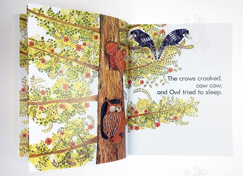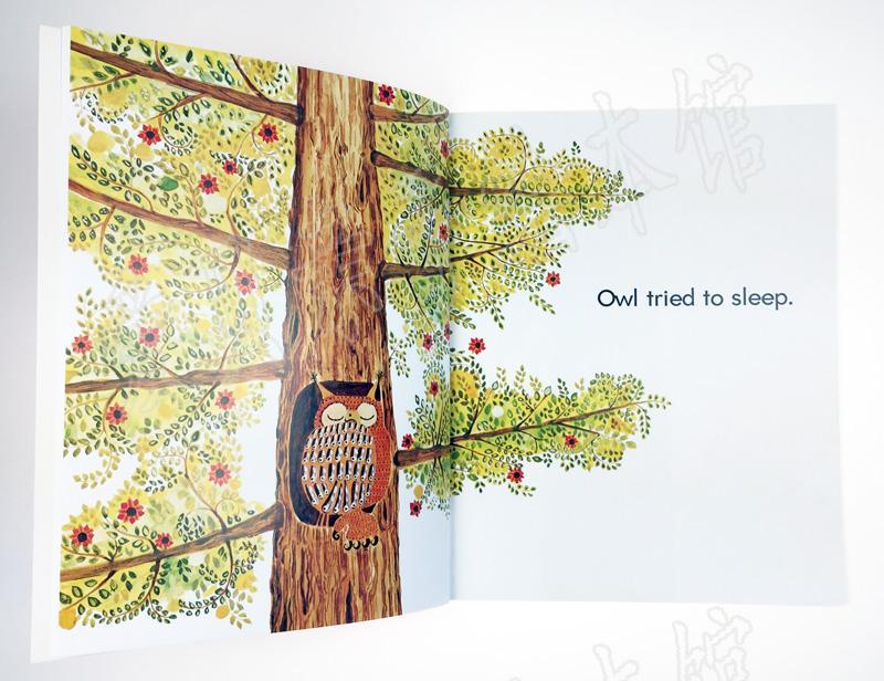 猫头鹰想要睡觉了,但树林里的动物们都在或哦的那个,蜜蜂嗡嗡、松鼠啃坚果、啄木鸟、松鸦、云雀。。。天哪!吵得猫头鹰无法睡觉。黑夜终于来临了,四周安安静静地,猫头鹰可以睡觉了么?